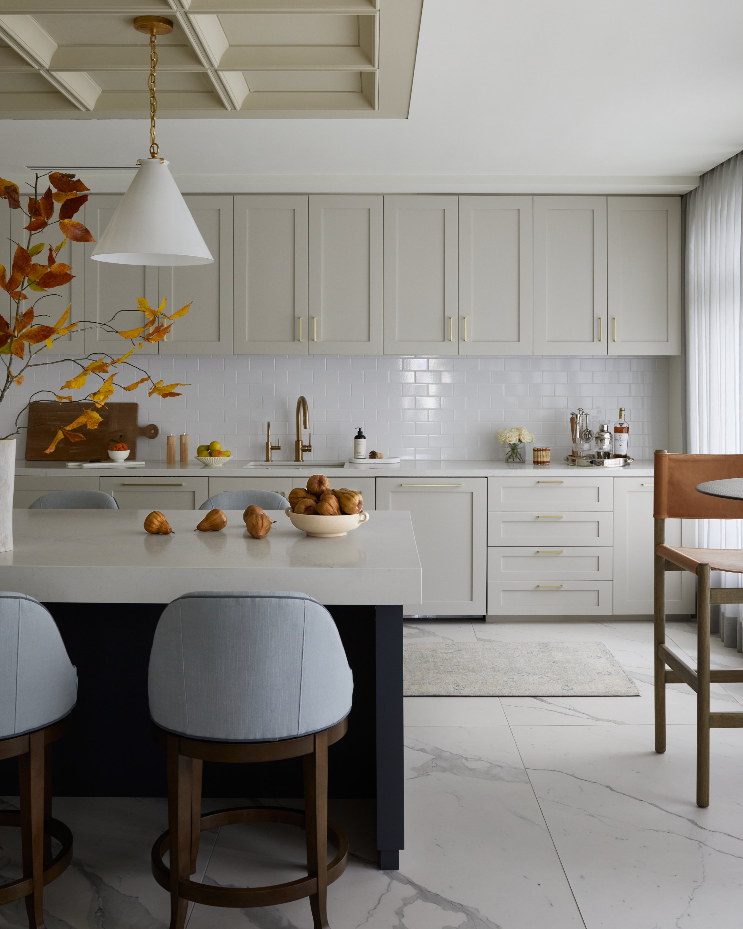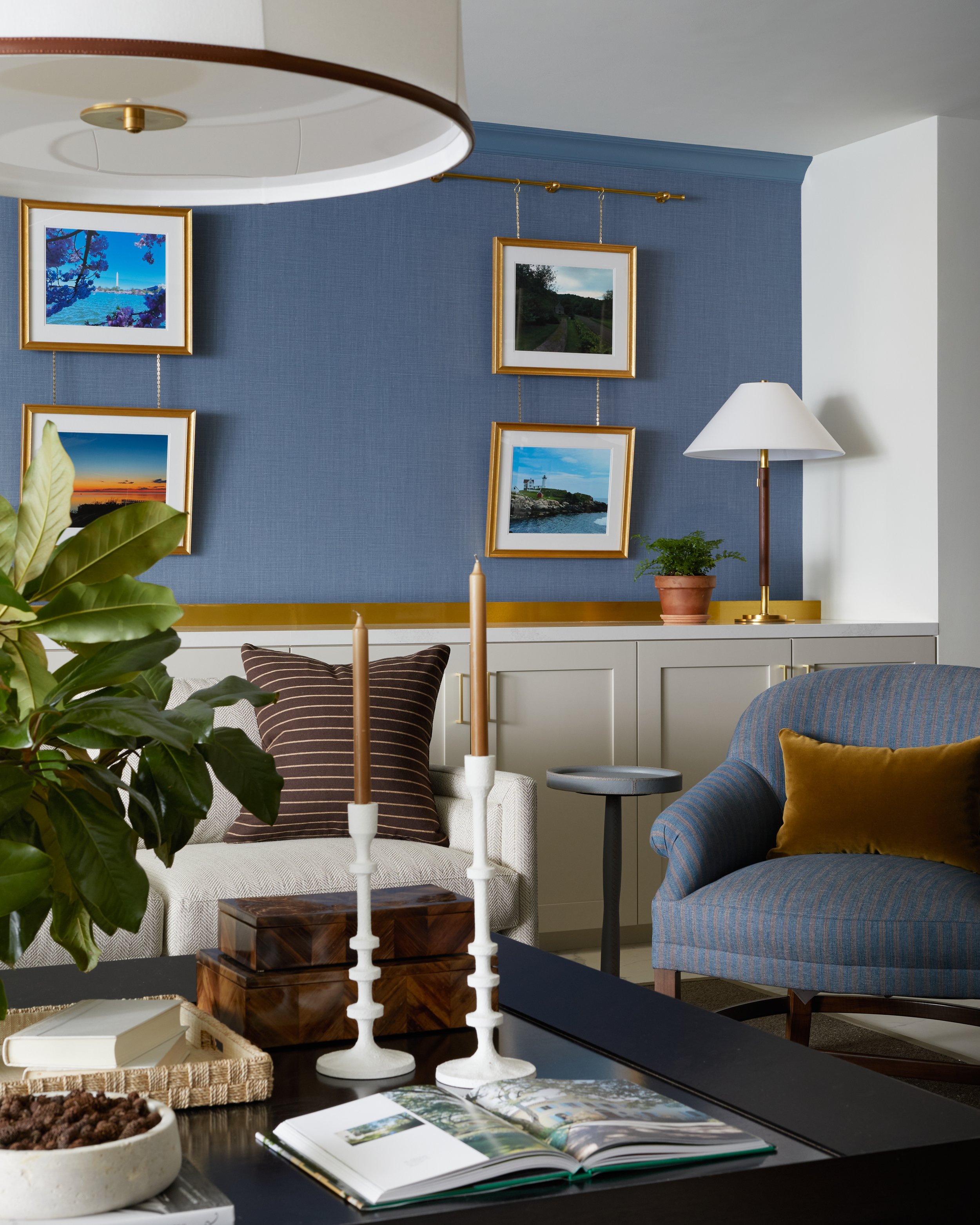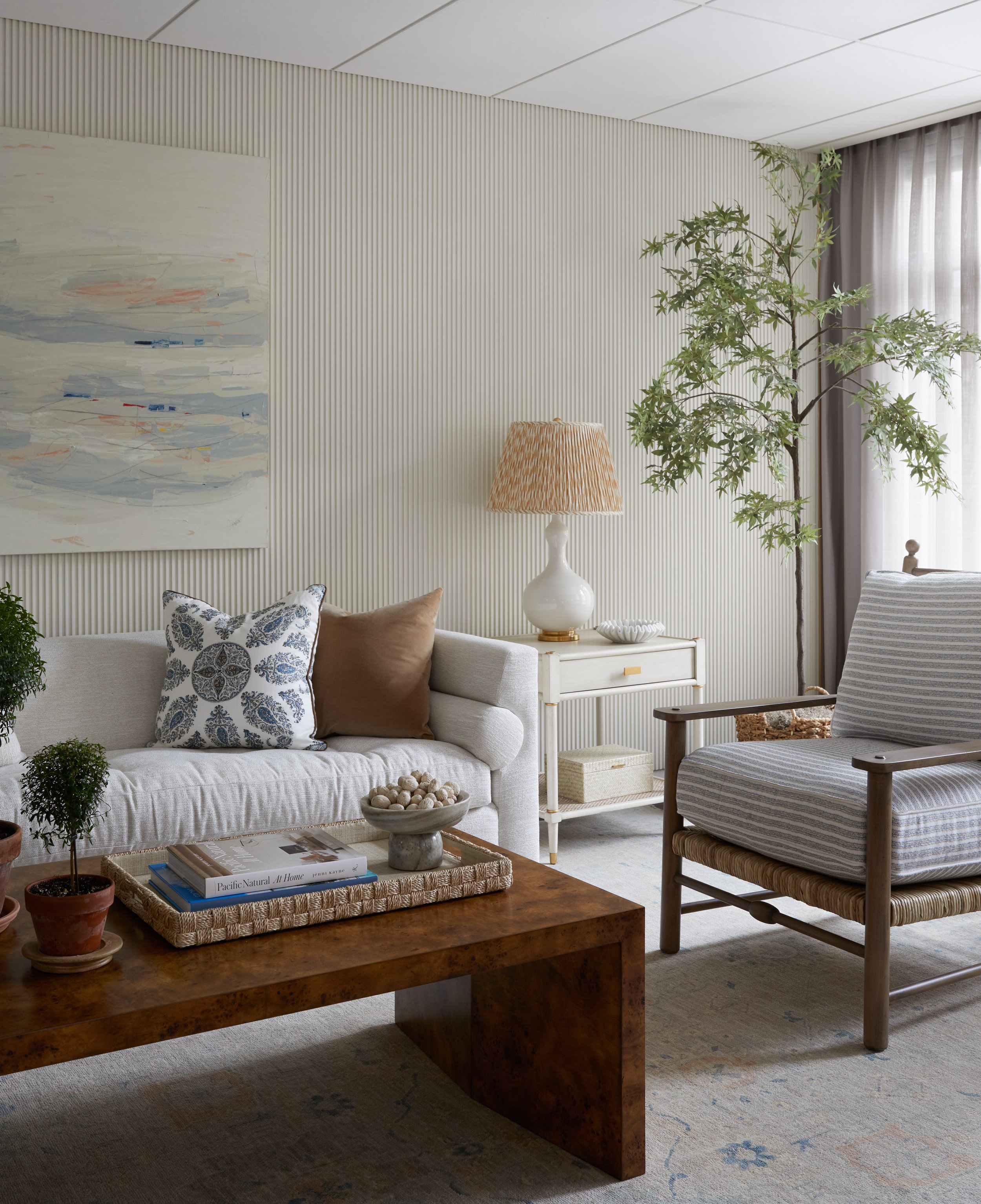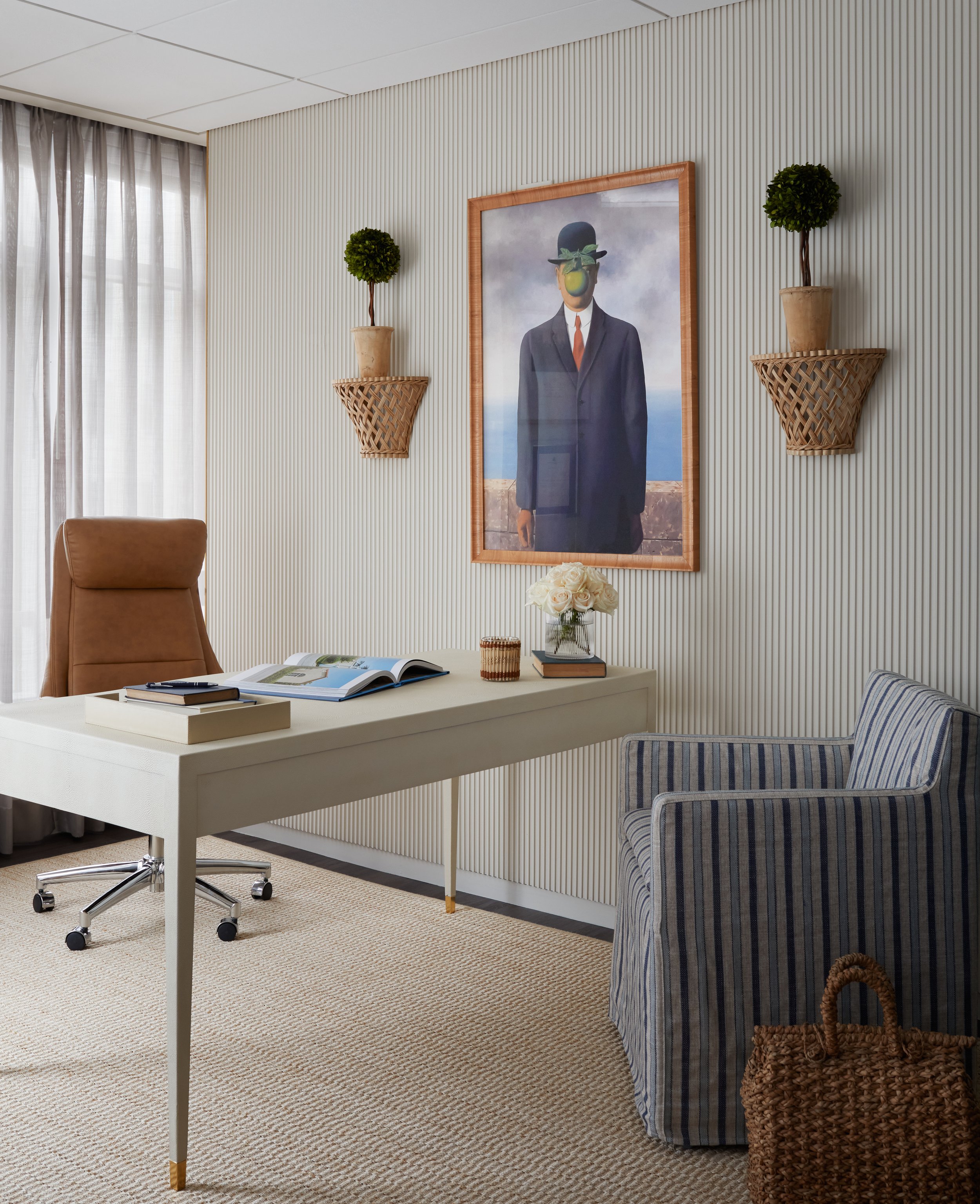 We introduced a soft foundation of warm whites, natural oak, and aged brass, which is complemented by tailored upholstery and rich, woven textures. The design blends these warm, natural materials with a collection of American art to create a space that is both refined and comfortable. In place of formal waiting rooms, we designed living-room-style lounges to encourage a sense of ease and connection. The result is a workplace that feels grounded, tailored, and unmistakably welcoming.
